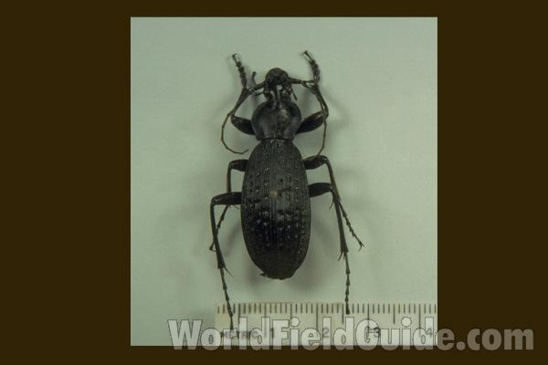 Ground Beetles, family Carabidae, are usually small beetles that live on the forest floor. They can run quite well as they generally have well-developed legs. Many Carabidae are carnivorous in that they eat other insects. The family is distributed worldwide.