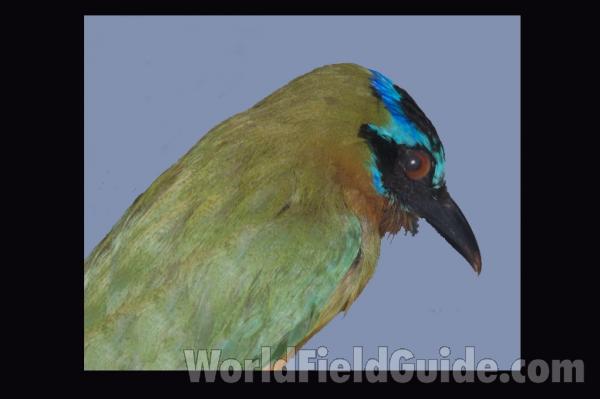 Blue Crowned Mot Mot (Momotus momota) is a Neotropical species and is a resident of a large area from Mexico south to Bolivia and Argentina. This is a variable species. The breast can be cinnamon green in some races. Note the unusual spatulate tails.
