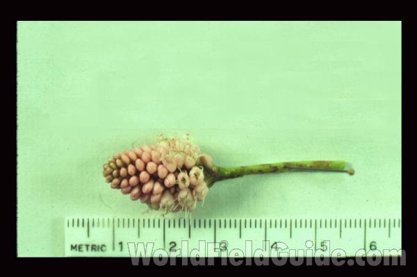 Water Smartweed (Polygonum amphibium) is found widely in North America and Europe. The taxonomy of this species, its associated forms, and associated species, is confusing. Roger Tory Peterson's "Field Guide on Eastern Wildflowers," calls those species with a long narrow spire that is usually over one inch long P. coccineum. Those species with spires less than one inch long are called P. amphibium. Some authors group all of these species into P. amphibum. The terrestrial forms of this species have quite different shapes than the examples found growing in water.Buckwheat Family (Polygonaceae) is comprised of about 850 species divided into about thirty different genera. This family had 29 genera and 435 species growing in greater North America as of 1994.
